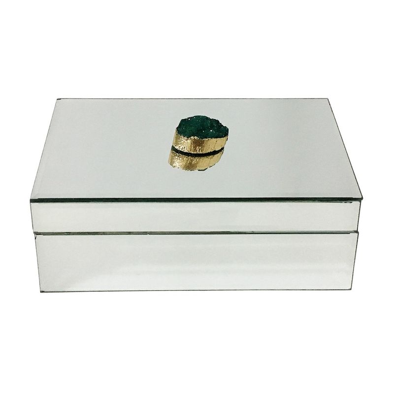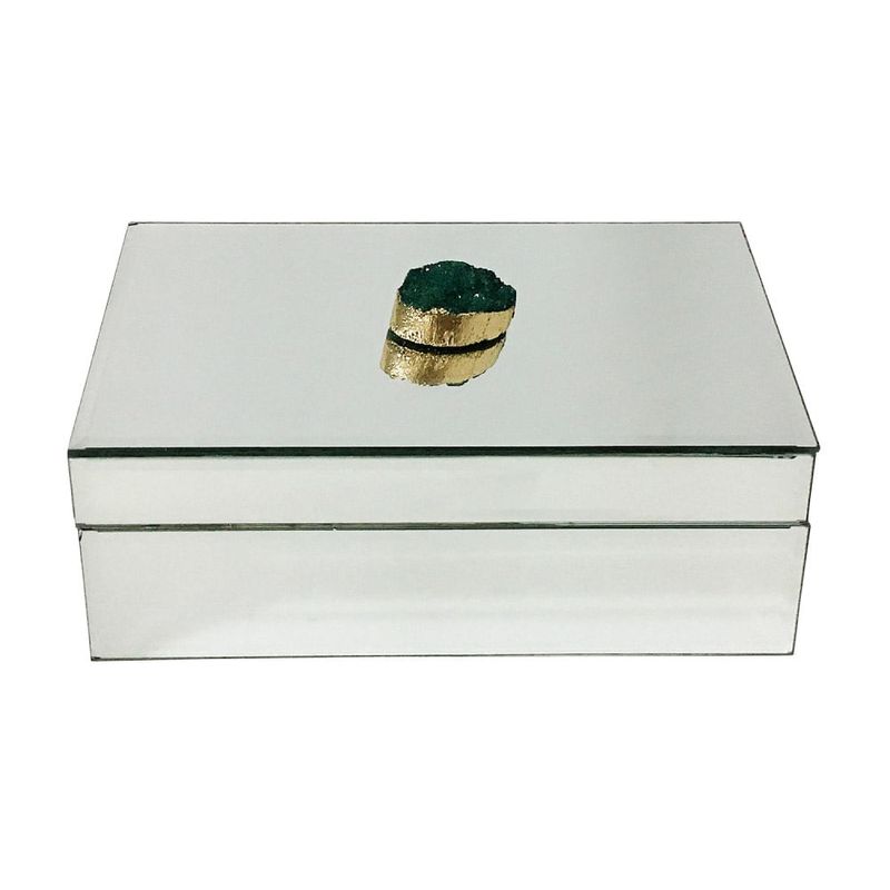 CAIXA DECORATIVA ESPELHADA COM PEDRA VERDE JADE 20X14X9CM
