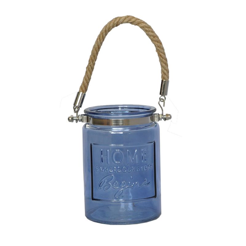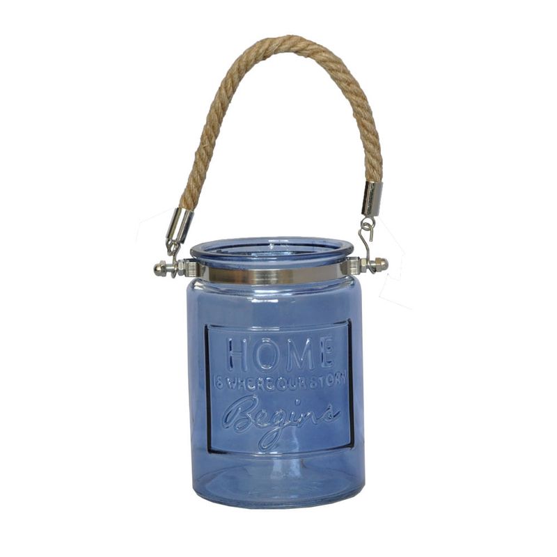 CASTIÇAL DE VIDRO EMBOSSED HOME AZUL COM ALÇA 9,6X13CM