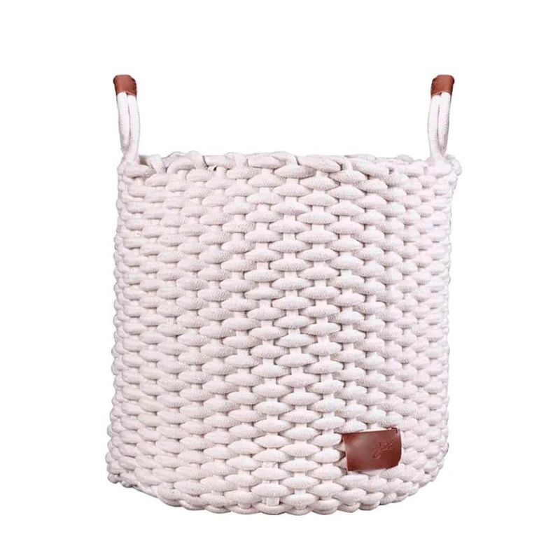 Cesto De Corda Algodão Branco Com Alça De Couro 34xh34cm