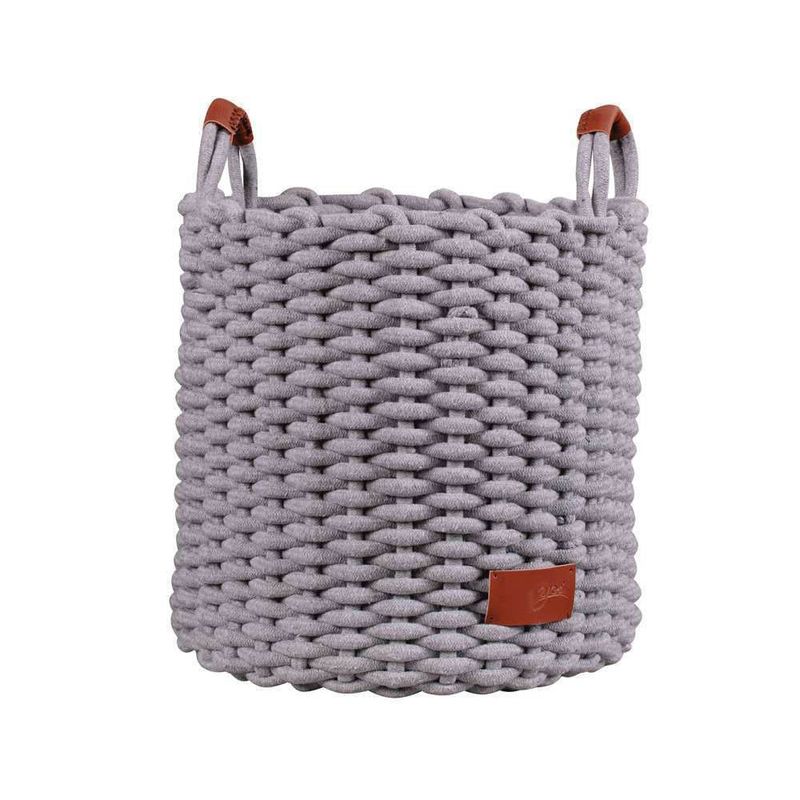 Cesto De Corda De Algodão Cinza Com Alça De Couro 38xh38cm