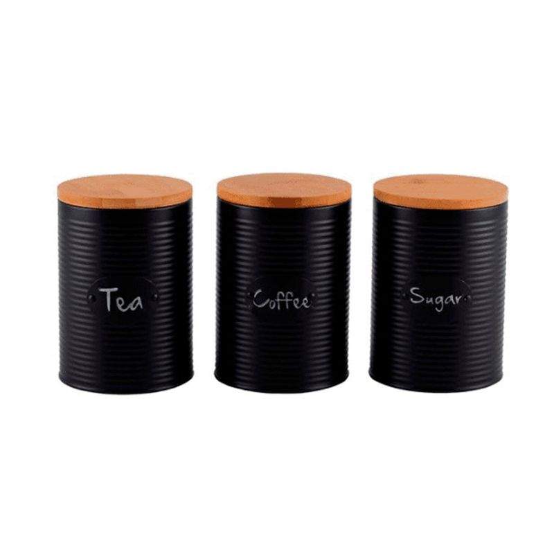 CONJUNTO DE POTES EM METAL PRETO E TAMPA DE MADEIRA