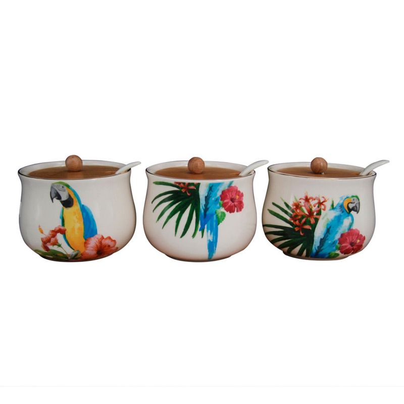 Conjunto De Potes Para Condimentos Araras De Cerâmica Com Tampa De Madeira