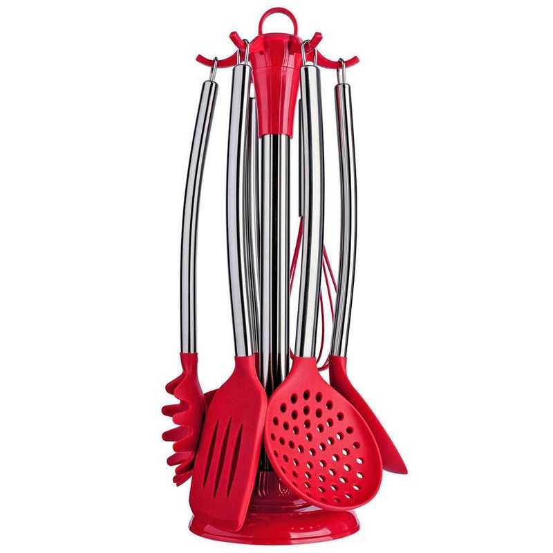CONJUNTO DE TALHERES DE SILICONE COM CABO INOX 7 PC VERMELHO