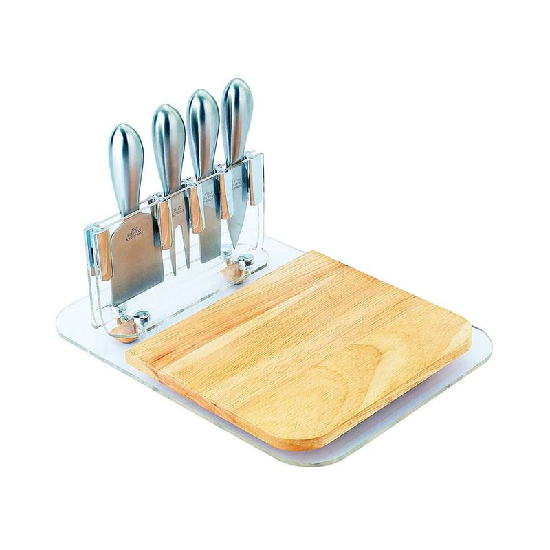 JOGO PARA QUEIJO COM SUPORTE EM ACRÍLICO E MADEIRA 5 PEÇAS