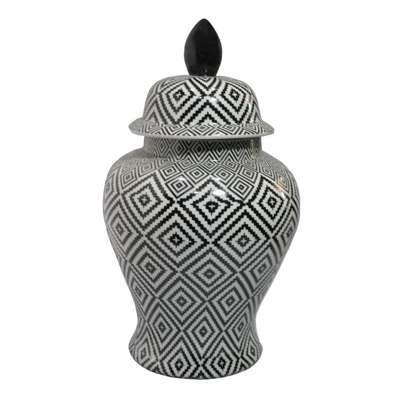 Potiche Redondo De Cerâmica Com Tampa E Desenho Geométrico Preto
