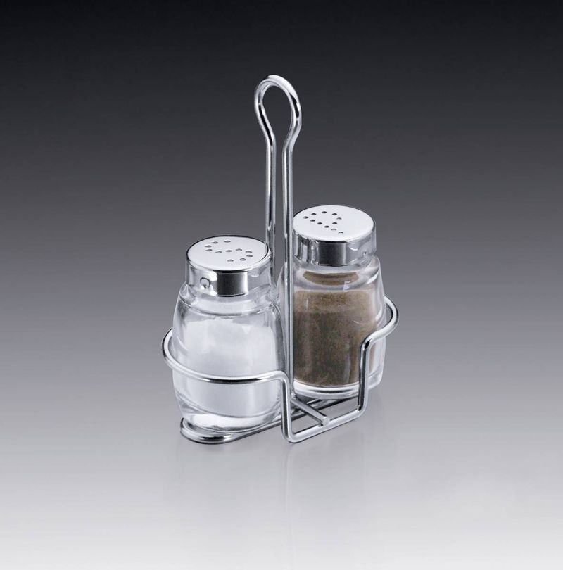 SALEIRO E PIMENTEIRO DE VIDRO COM SUPORTE DE PRATA ARAMADO