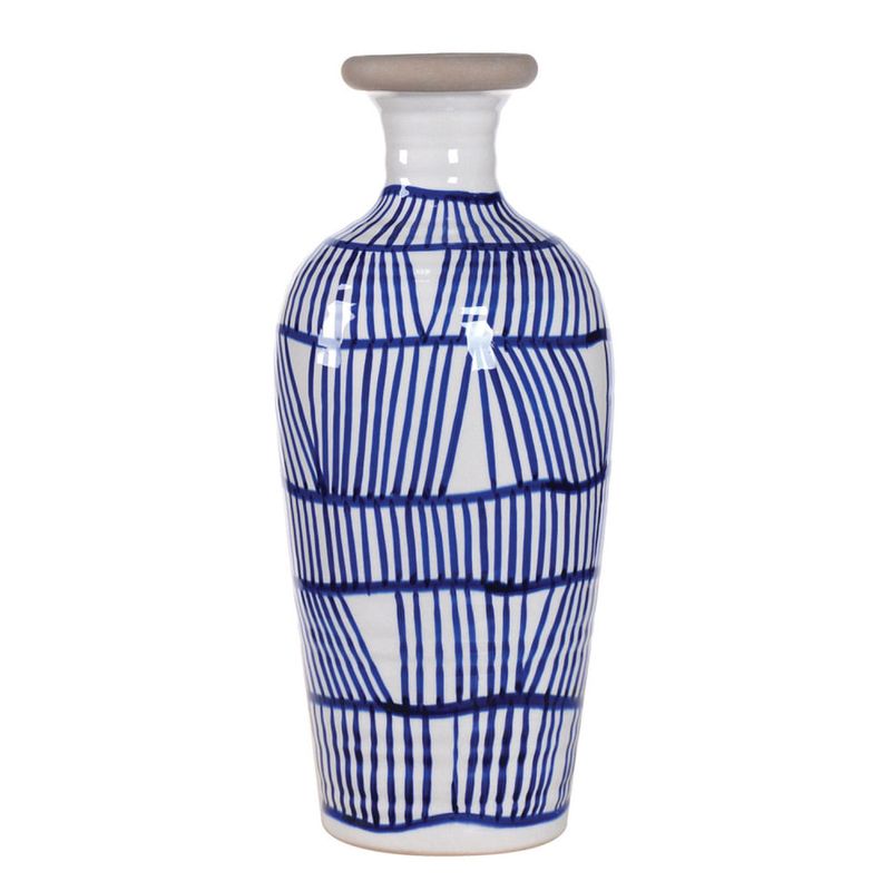 Vaso De Cerâmica Azul E Branco Decorativo 18x40cm