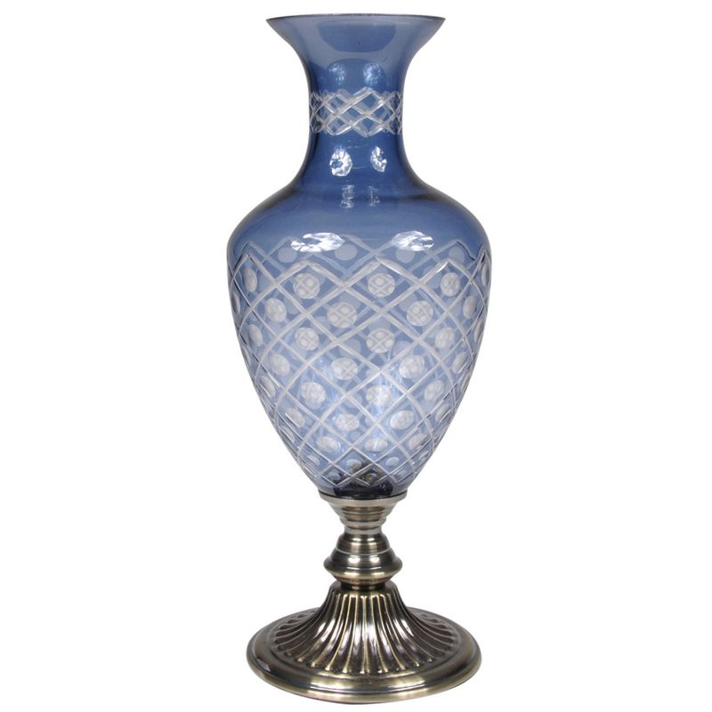 VASO DECORATIVO DE VIDRO AZUL E BRANCO COM PÉ DE METAL 17X46CM